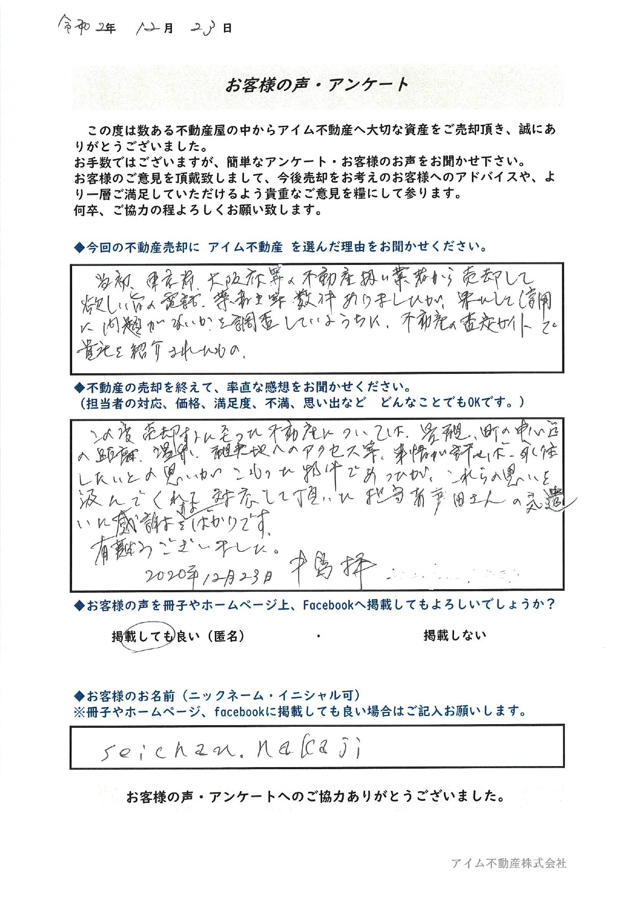 【お客様名】seichan nakaji様 ◆今回の不動産売却にアイム不動産株式会社を選んだ理由をお聞かせください。 当初、東京都、大阪府等の不動産扱い業者から売却して欲しい旨の電話、葉書き等、数件ありましたが、果たして …