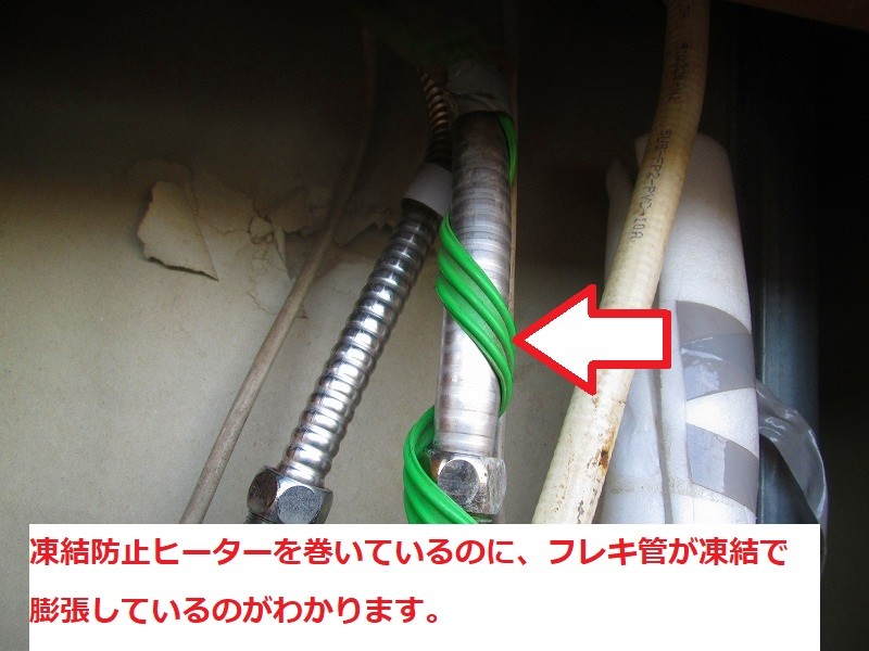 右側の管の中は凍結の氷で膨張しています。 ブレーカーを下げた部屋なので、緑色の凍結防止ヒーターが役に立っていません。 この部屋の住人は、凍結防止を呼びかけていたのに、無視した結果水漏れ事故を起こしました。 寒い冬に部屋を …